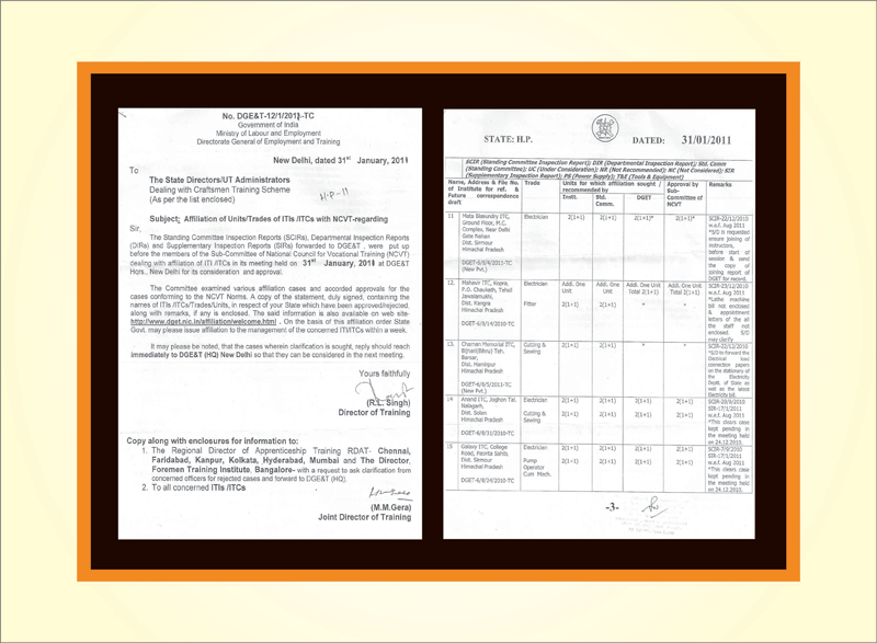 The ultimate aim of education is not only to enhance knowledge but behaviour, manners and the development of overall personality. Today's student are tomorrows future of the nation by becoming professional. The vision is to prepare technically and morally strong citizens who in future become precious assets of nation. Secondly, Mata Balasundry Institute is also alive to the situation of unemployment among the educated youth. It feels its duty to make them educated, technically strong and capable of achieving an honorable job in Govt ./Pvt. Sector/ Prestigious organization etc. Thus to save themselves from the economic crisis of the present age. which is the root cause of social backwardness as well as social evils. Mata Balasundry Institute is full filling those aims and objectives in establishing this ITI to produce highly employable youth. The objective of Mata Balasundry Institute is to impart affordable relevant, skill based & remunerative technical education to the masses of H.P. Mata Balasundry Pvt. ITI is affiliated to NCVT. DGE&T, Govt, of India vide letter no DGET- 6/8/4/2011-TC (New Pvt.) & approved by Deptt. of Technical Education. Sunder Nagar (Govt, of Himachal Pradesh).