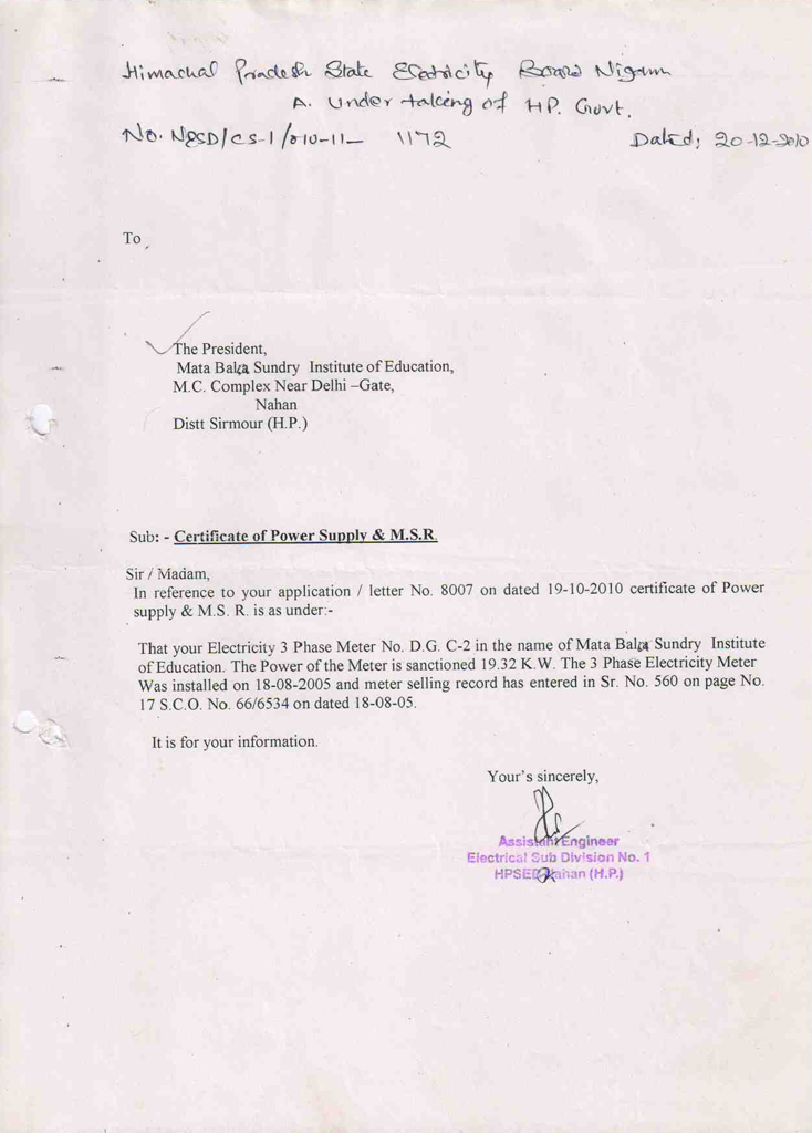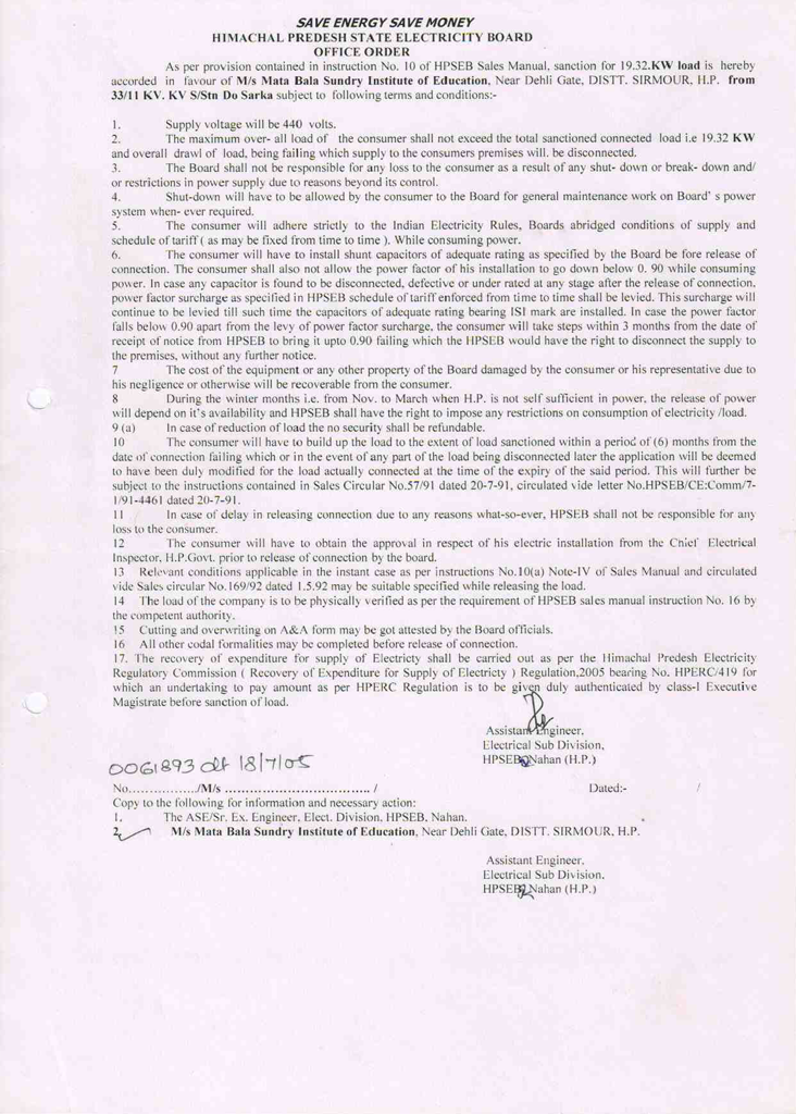 Mata Balasundry Pvt. ITI Nahan Estb. 31st Jan 2011